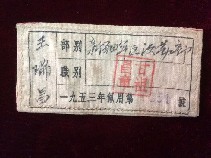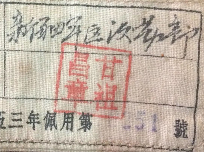 这枚布标早已泛黄,但是保存非常完整,该枚布标佩用的年限是1953年,布标编号为0251,非常难得的是此枚布标加盖有甘祖昌将军的大红印章,印章至今依然是红彤彤的清晰可见。我要将这枚珍贵的《中国人民解放军布标》作为传家宝一代代传下去,让后代学习革命先辈们的无私奉献精神,传承好红色血脉。