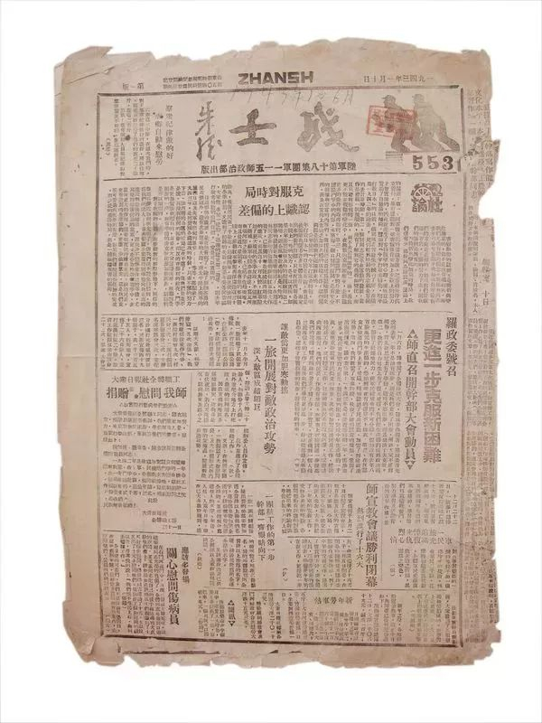 传家宝描述:《战士报》,1943年1月10日,四开四版,第553期,该报是十八集团军115师政治部机关报,前身是中国工农红军红一军机关报,1940年8月,在山东抗日革命根据地复刊,解放战争时期随罗荣桓同志挺进东北,1948年又随东野(改四野)南下,建国后成为广州军区政治部机关报,2016年1月15日停刊。罗荣桓元帅曾赞誉这张报纸“一个铅字比一颗子弹还重要”。