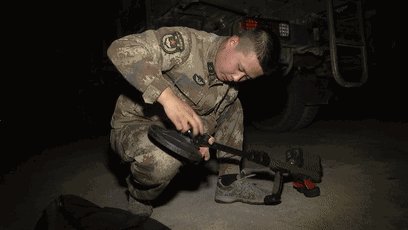 会上大家讨论激烈,战士们也正忙着维护保养和调试探雷器,检测导电线。虽然每天都擦拭保养,但每个探雷器的探盘上都布满了大大小小交错的划痕,让人不禁联想到它们和官兵们共同经历的那些磨难与危险。在扫雷官兵中有一个不成文的规矩,就是探雷器不相互转借。因为它们不仅是排雷官兵手中的武器,也是准确定位地雷和爆炸物避免伤残甚至更严重后果的依仗,是官兵们深深信赖的伙伴。