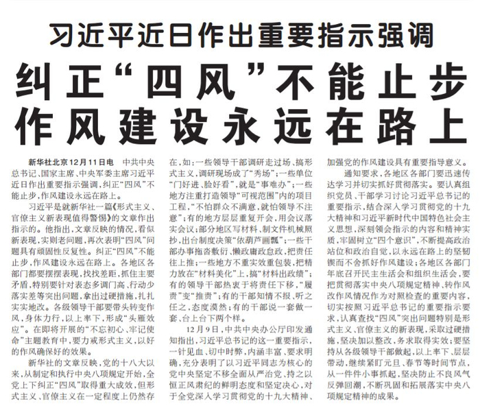 前不久,习近平总书记就新华社一篇题为《形式主义、官僚主义新表现值得警惕》的文章作出重要指示,对各地各部门和各级领导干部继续加强作风建设提出明确要求。