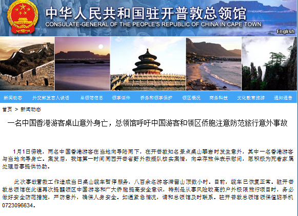 中新网1月3日电 据中国驻南非开普敦总领馆网站消息,当地时间1月1日傍晚,两名中国香港游客在南非当地向导陪同下,在开普敦知名景点桌山攀岩时发生意外,其中一名香港游客与当地向导身亡。