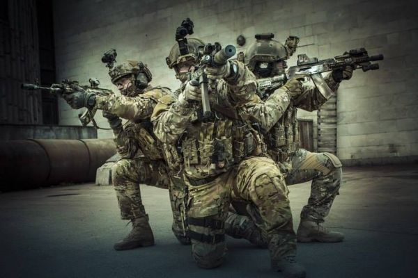 特战队员使用AK-105突击步枪打靶,配有全息式瞄具和战术握把组件。
