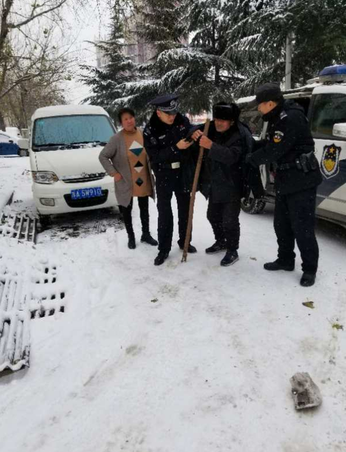 到场后民警发现老人依着拐棍在人行道上迷茫的站着,尽管穿的厚实,但在凌冽的寒风下仍然瑟瑟发抖,雪花飘满帽子和衣领,老人的双手也被冻得通红,殷少磊急忙脱下身上的大衣为老人披上御寒,随后将老人扶上警车取暖。见到民警的到来,老人的脸上也露出了安心的笑容。