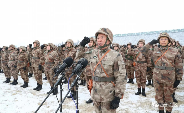 统帅训令仍在耳畔激荡,数千名官兵迎着鲜艳的军旗,庄严举起右拳,重温入伍誓词:“我是中国人民解放军军人,我宣誓:服从中国共产党的领导,全心全意为人民服务……时刻准备战斗,绝不叛离军队,誓死保卫祖国。”军旗在寒风中猎猎飞扬,将士们铿锵豪迈的誓词响彻沙场。