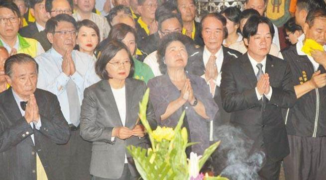 蔡英文(左三)前往南鲲鯓参拜,台南市长赖清德(右二)、高雄市长陈菊(右三)、屏东县长潘孟安(左二)陪同出席。