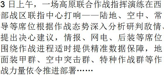 “防空兵群实施联合空情预警,防范敌机突袭”“炮兵群运用远程火力摧毁岸滩火力点”……