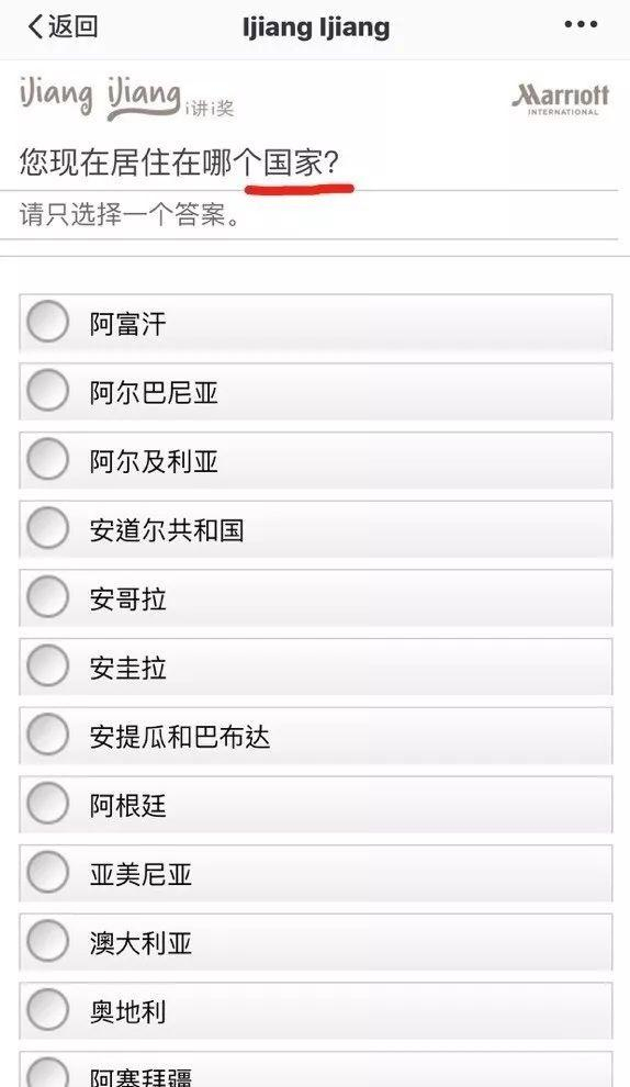 @仲举扫地 发现,与官网不同,这封内部活动邮件性质更为恶劣。邮件内容提示会员与酒店互动调查,根据提示操作时,他发现,在国家/地区选择时,万豪国际酒店不仅将香港、台湾、澳门单列出来,西藏也竟然赫然在列!