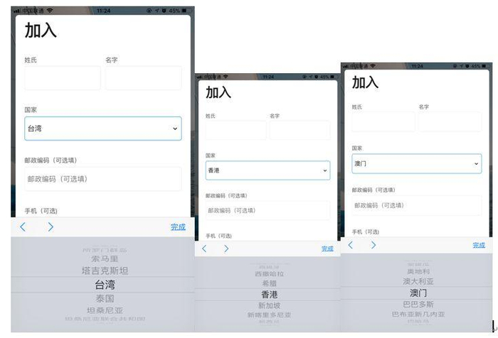 在“国家”选项的下拉菜单中,万豪将台湾、香港、澳门都归为了“国家”。