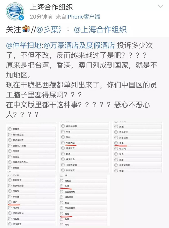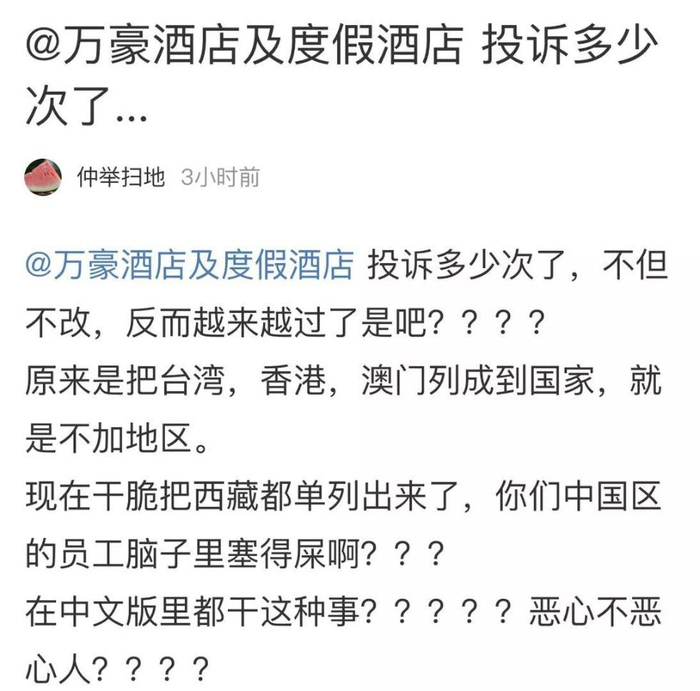 把港澳台和西藏列为"国家" 万豪国际酒店想干什么