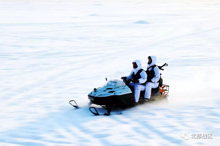 乘坐摩托雪橇巡逻边境。
