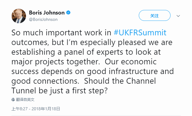 随后,约翰逊还发布推文说:“我们的经济成就靠的是良好的基础设施与联系,英吉利海峡海底隧道应该只是第一步?”