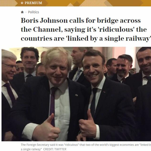 约翰逊表示,世界最大经济体之二——英法两国之间只靠一条铁路连接是“荒谬可笑的”。他建议在两国之间建造第二条通道,马克龙当时也回应道:“我同意,就这么做!”