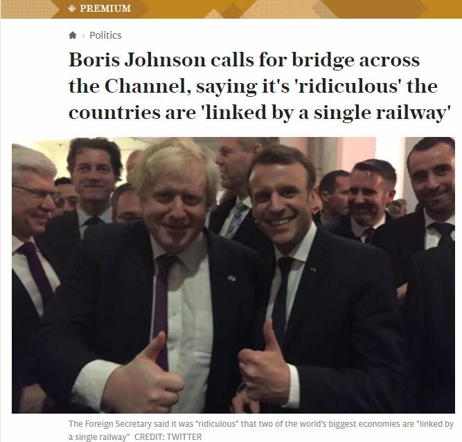【环球网报道 记者 朱梦颖】仅一条铁路连接英法是“荒谬的”,英国外交大臣鲍里斯·约翰逊18日向法国总统马克龙表达了建立跨海大桥的构想。马克龙也当场表示“同意”。