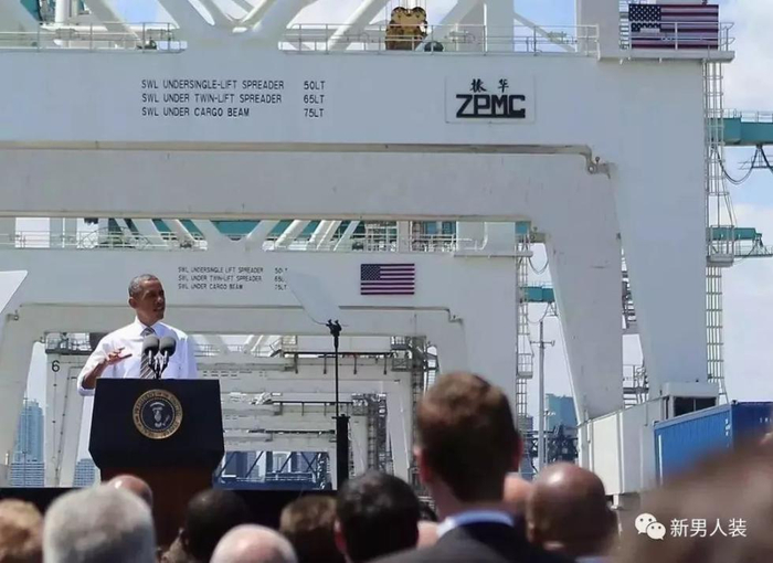 当天风大,全美国民众都在电视上看到总统身后,起重机上的小国旗掉了,露出“振华”(一个中国企业)的字样 。