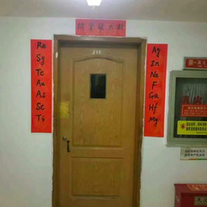 “Ag Zn Na F Ga Hf Mg”“Re Sg Tc Au As Sc Ti”,这不仅是两组化学元素,还是一副对联。1月16日,南京林业大学家居与工业设计学院辅导员李雍在路过学生寝室时,发现一副用化学元素周期表里的元素符号拼成的对联贴在门两旁,感觉挺有趣。于是,随手拍下传到了网上,并被大量转发。