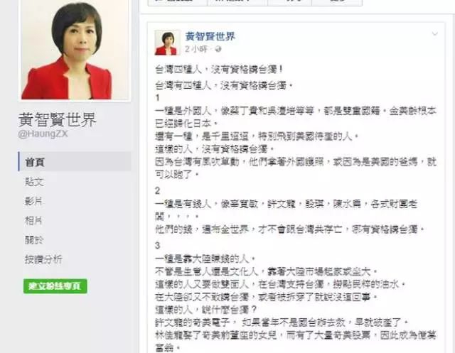 黄智贤曾在脸书发文抨击,称台面上主张“台独”者多是虚伪之徒。