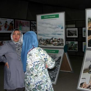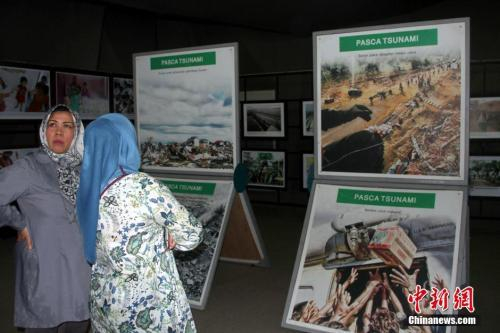 资料图:2014年12月25日,观众在印尼亚齐市中心的海啸博物馆内参观海啸遗骸、图片展,纪念海啸灾难10周年。 中新社发 顾时宏 摄