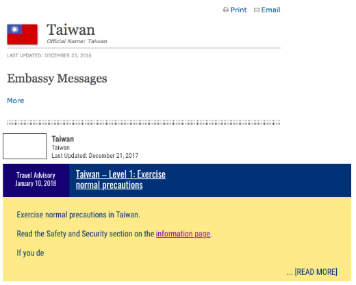 此外,美国国务院领事事务局官网近期改版,在其关于台湾的页面中,“青天白日满地红旗”图案也已消失,目前仅剩一个白色长方形图示。该页面显示最后一次更新为去年12月21日,该网站其他页面同样是2017年12月21日更新,但其他旗帜照常。