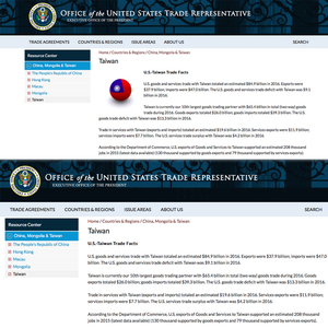 据报道,在美国贸易代表署官网“国家与地区”栏目下,介绍各国或地区与美国的贸易情况,台湾列于“中国大陆、蒙古与台湾”名目下。特朗普政府去年上任后,美国贸易代表署网页曾改版,但去年6月关于台湾的页面上仍有“青天白日满地红旗”图案。而现在台湾页面的“青天白日满地红旗”图示已消失,其他图示照常。