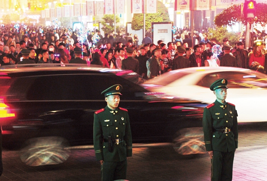 2017年12月31日晚,4000名武警官兵驻守在上海外滩、南京路步行街等主要旅游景点,确保节日里市民、游客的平安。(图片来源CFP)