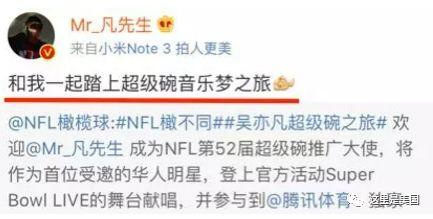 除了“超级碗”暖场秀,吴亦凡还被NFL选为本届超级碗的中国推广大使 。