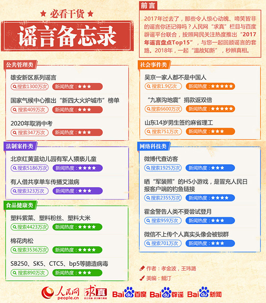 人民网北京1月30日电 2017年过去了,那些令人惊心动魄、啼笑皆非的谣言你还记得吗?人民网“求真”栏目与百度辟谣平台联合推出年度盘点,跟小伙伴们一起回顾谣言的套路。希望在新的一年,如果再遇到这些谣言改头换面,大家都能慧眼如炬,秒辨真相。