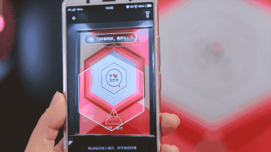 没错,用支付宝的AR扫一扫对准图案,手机屏幕上就会出现AR宝箱,点击之后有机会获得商家优惠券等奖励。