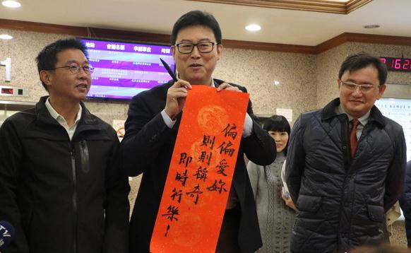 姚文智挥毫以春联隔空回复。(图片来源:台媒)
