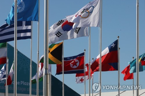 平昌冬奥参赛方国旗迎风飘扬。(韩联社)