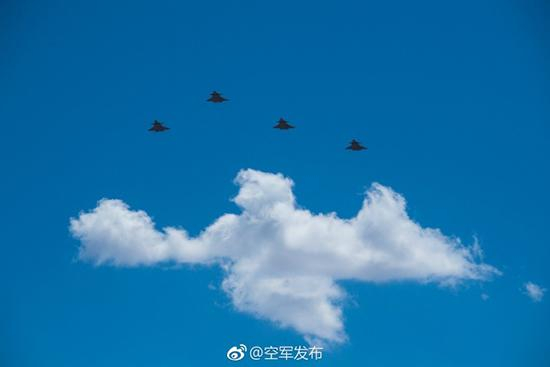 2017年10月20日,中国空军官方微博发布了一张4架歼-20战机编队飞行在白云之上的照片
