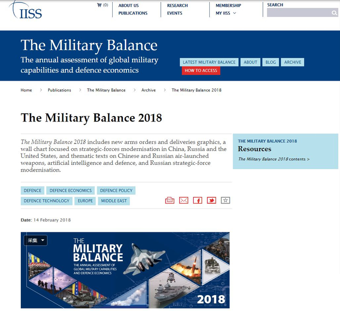 ▲国际战略研究所14日发布2018年《军事力量对比》。
