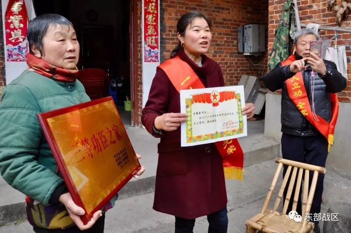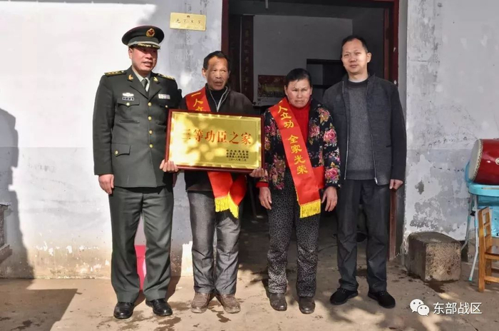 ▲金溪籍军官夏伟的父母在外地,县人武部把立功喜报和“三等功臣之家”牌匾送到他的岳父岳母家,两位老人对女婿立功很是骄傲和欣慰。