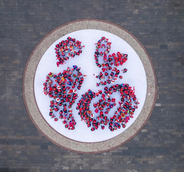 ▲2018年1月1日,贵州省凯里市下司古镇。300多名群众和游客,头戴红色帽子,拼成一个大“福”字,迎接新年。山花烂漫 摄