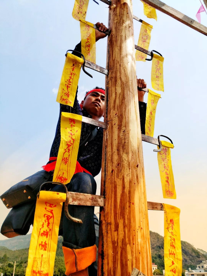 ▲2018年2月20日,广西壮族自治区容县。正月初五,山村里按风俗习惯举行上刀山仪式,祈求老少平安风调雨顺。植宇燕 摄