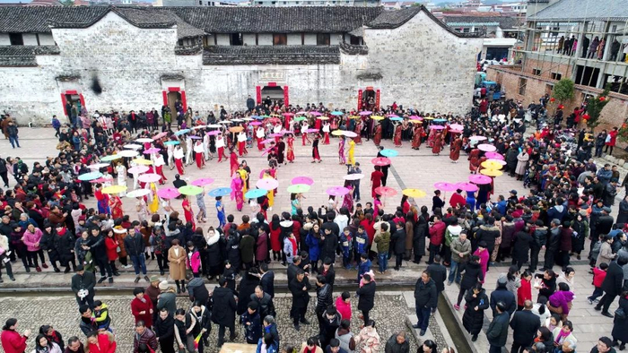 ▲2018年2月21日,浙江省仙居县。来自美国、英国、韩国等国的40余位外国友人,走进浙江省仙居县埠头古村,与当地群众一起观看村民磨豆腐、捣麻糍、舞龙、旗袍走秀、秧歌等表演,快乐体验极具民族风味的中国年俗,感受浓浓的中国传统民俗文化。王华斌 摄