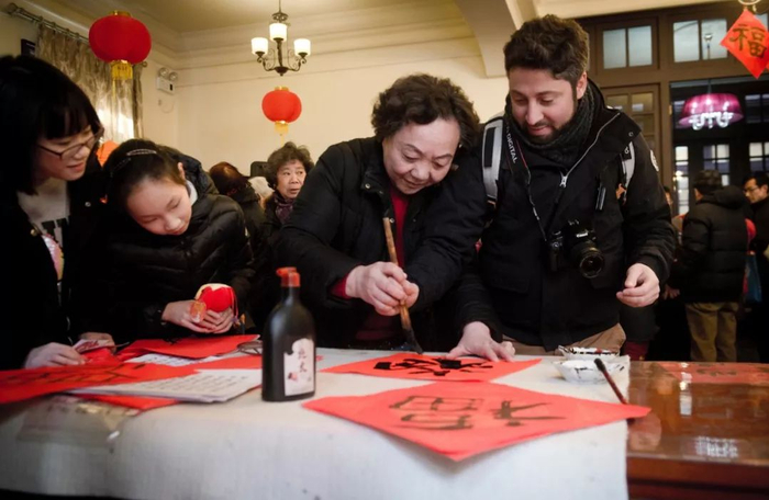 ▲2018年2月12日,上海市张园。外国游客对中国书法颇感兴趣,书法家手把手地教写中国“福”字。钱康远 摄