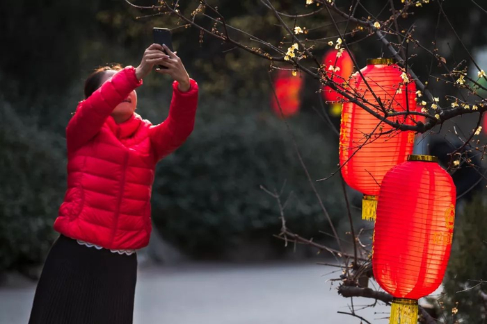▲2018年2月21日,山东省济南市。梅蕊腊前破,梅花年后多。公园中,春节假期最后一天,游人在拍摄绽放的梅花。张洪举 摄