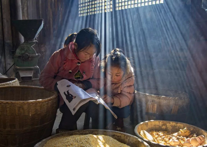 ▲2018年1月14日,湖北省利川市。团堡镇高岩村两孩子在阳光射进的木屋里,专注地翻看杂志。利川六哥 摄