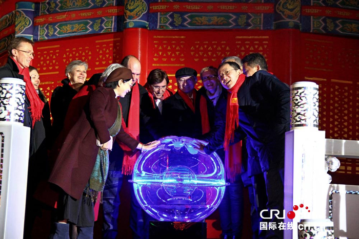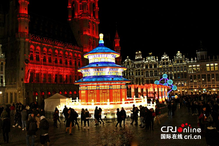 当晚布鲁塞尔的气温接近零下4摄氏度,但被列入世界文化遗产名录的布鲁塞尔大广场依然人头攒动。当地时间晚上7点50分左右,伴随着“三、二、一”的欢呼声,摆放在大广场上的大型彩灯――北京天坛、布鲁塞尔的原子球以及连接两者的红灯笼长廊瞬间被点亮。大广场周边地区的其它彩灯,如熊猫、天鹅、青花瓷、京剧脸谱和十二生肖等也同时披上了美丽的彩衣。