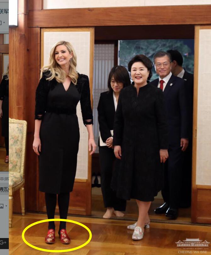 报道称,因担心伊万卡不熟悉在室内脱鞋的文化,金正淑亲自制作了这双鞋。青瓦台相关人士24日接受(电话)采访时表示,金正淑不仅亲自挑选了拖鞋的绸缎,还亲自参与了设计和制作。这双拖鞋用红色与棕色缎面制成,并绣有花的图样。