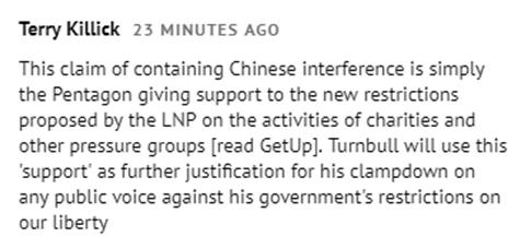 另一名网民则认为,五角大楼官员的此番表态是为力挺澳执政党提出的对慈善组织等机构活动的限令。以便澳大利亚总理特恩布尔能用这种“支持”为他压制反对的声音辩护。