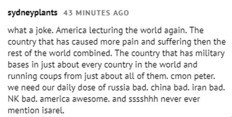 有网民说,真是笑话!美国又在教育世界了。这个国家给世界带来的痛苦和磨难比其他国家的总和还要多。每天都被灌输这样的信息:俄罗斯很坏,中国很坏,伊朗很坏,但美国是极好的。