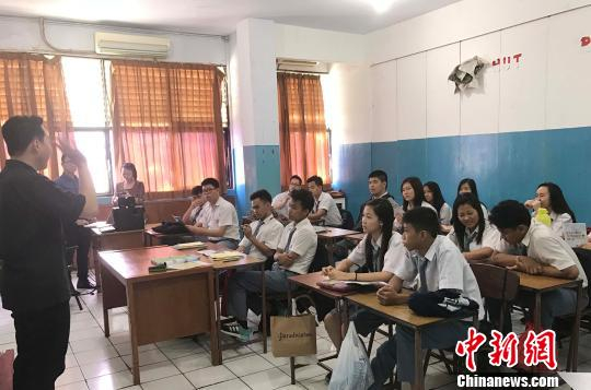 由印尼人力资源公司(HRI)发起、数十所中国高等职业教育学校实施的“scholarship +greatjob”奖学金项目,1日在印尼首都雅加达TRI RATNA高中学校正式启动招生。 韩煦雅 摄