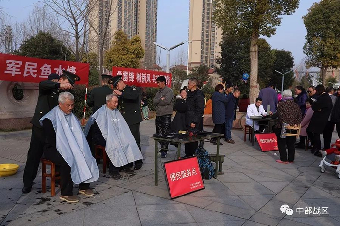 驻地音乐广场上人声鼎沸,热闹非凡。被市民们围得水泄不通的便民服务站成为广场上的一大亮点。4名精干帅气、心灵手巧的兵哥正在聚精会神地为群众理着发,身旁早已排起了长长队伍;医疗小分队一丝不苟地为市民测量血压,提供健康咨询;雷锋精神宣讲小组则成了小朋友们的最爱,战士们手捧图书,专心地为他们讲述着雷锋的故事。市民王先生激动地说:“这样的活雷锋出现在身边,让生活充满了感动与幸福。”