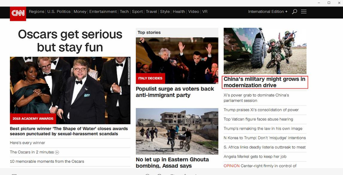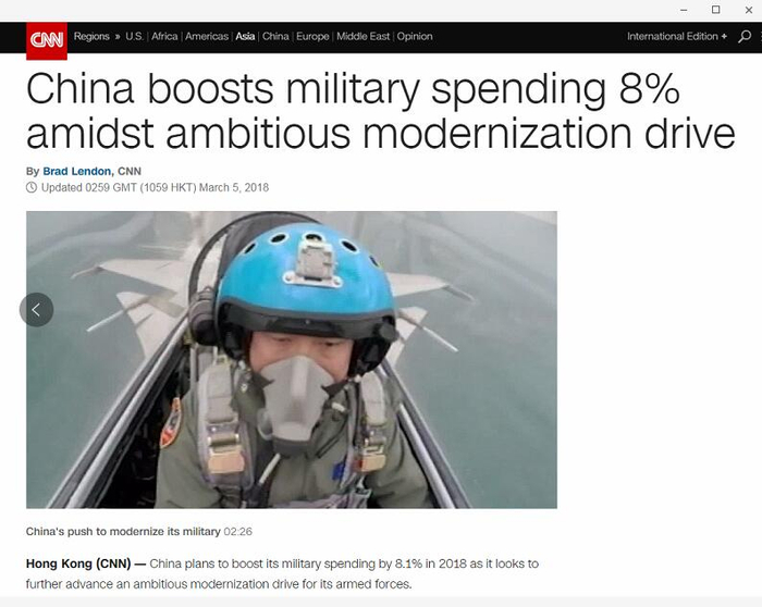 与这些军费增长创新高的国家相比,中国国防预算可谓是四平八稳。但没想到,CNN网站的头条还是以“在雄心勃勃的现代化进程中,中国军费涨幅为8%”进行了报道。