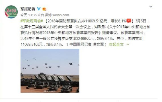 3月5日,在第十三届全国人民代表大会第一次会议上,财政部《关于2017年中央和地方预算执行情况与2018年中央和地方预算草案的报告》提请审议。预算草案提出,2018年中央一般公共预算本级支出32466亿元,增长8.1%。其中,国防支出11069.51亿元,增长8.1%。
