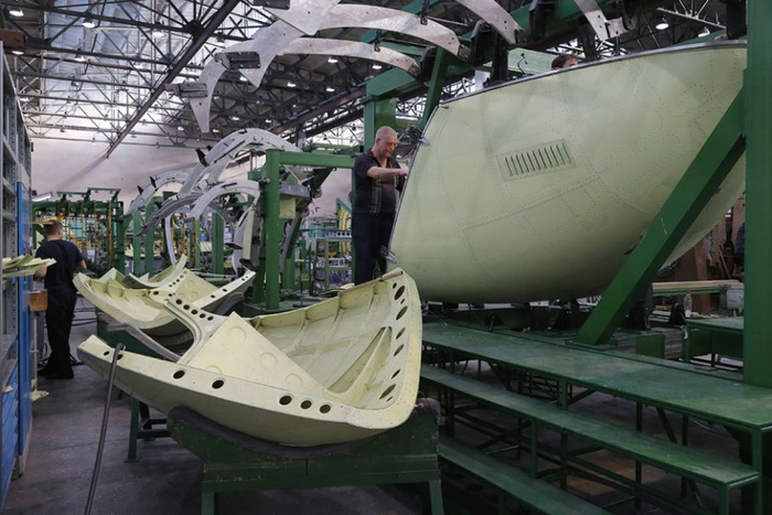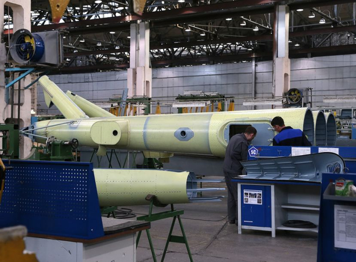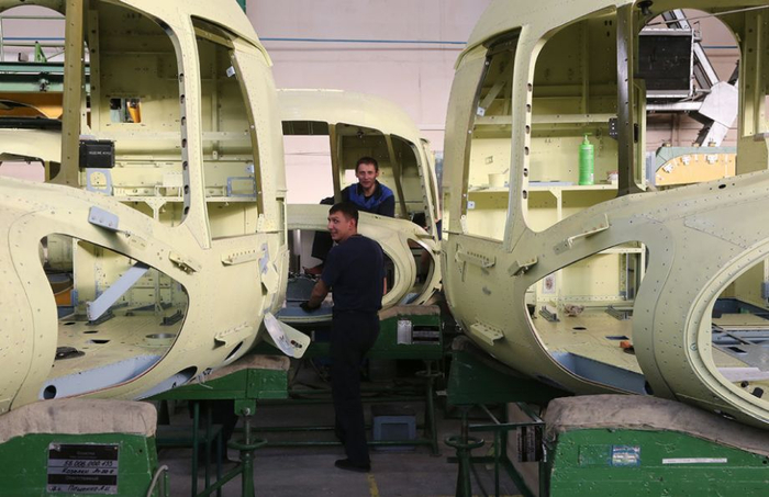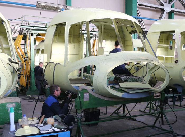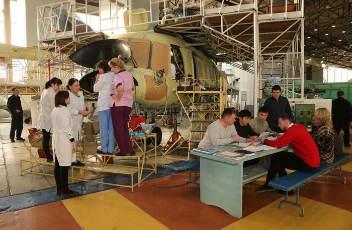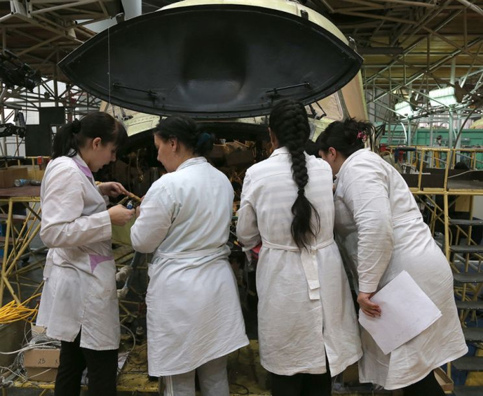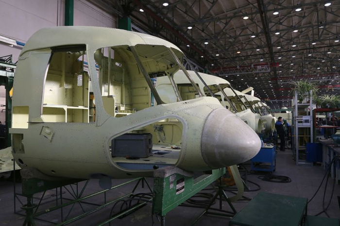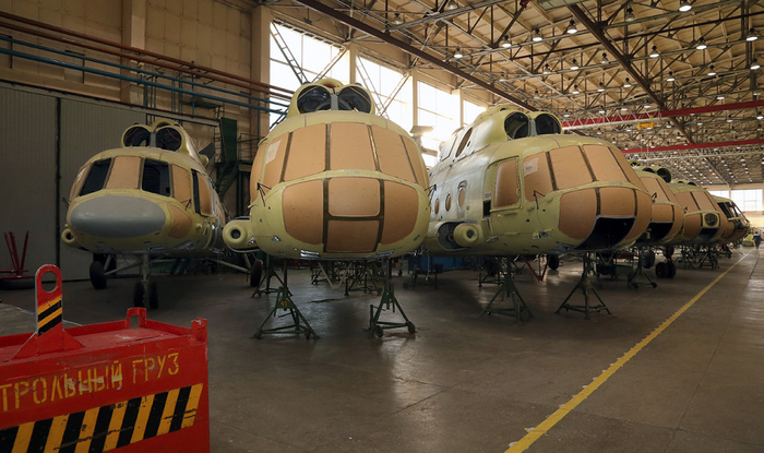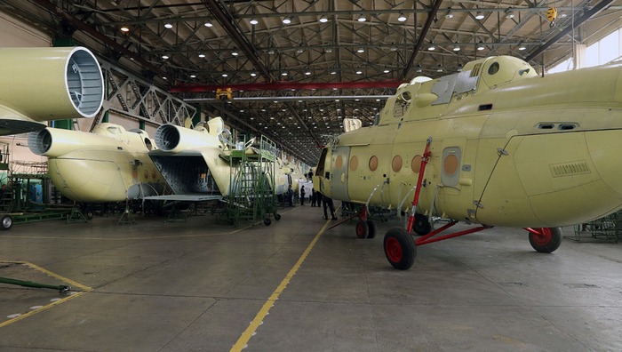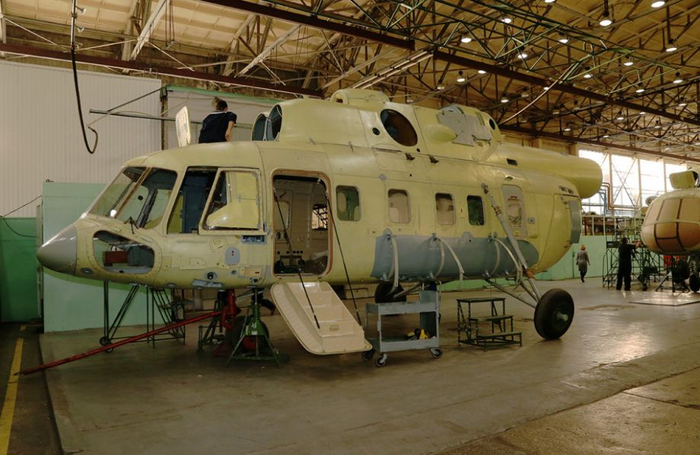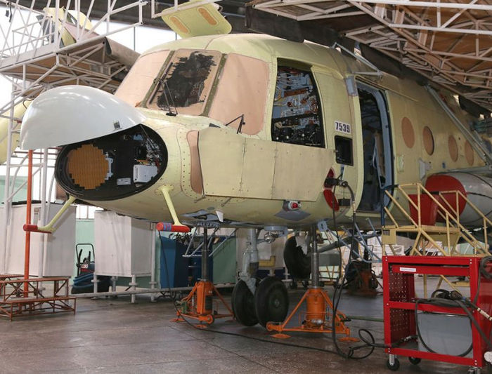 正在进行维护作业的米-8直升机,开启的机头雷达罩内可见机载雷达。