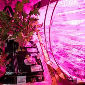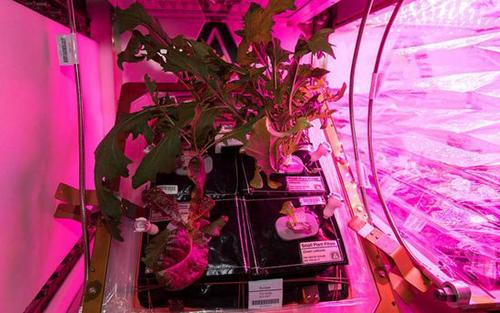 国际太空站人员在粉红温室里培育太空蔬菜。图片来源:NASA。