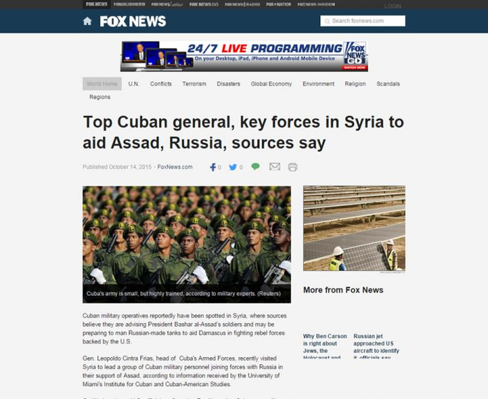 美国福克斯新闻网有关古巴出兵的报道网页截图。另据俄媒报道,古巴驻大马士革大使馆代表否认有古巴军人进入叙利亚的消息,称 “这是无稽之谈,胡言乱语”。