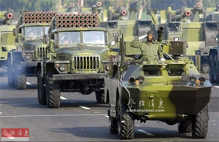 据美国福克斯新闻网10月14日报道,古巴派兵前往支援叙利亚巴沙尔政权,其或将驾驶俄制坦克配合叙政府军与叛乱分子作战。图为古巴国庆阅兵式上的BM-21多管火箭炮车方队。